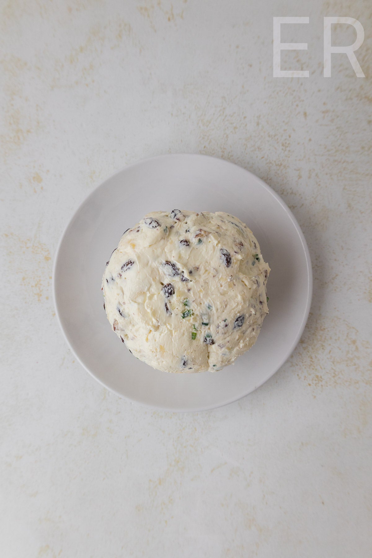 Ingredients: Full-fat cream cheese, sharp white cheddar, garlic powder, sea salt, black pepper, toasted pecans, dried raisins, chives, pumpkin seeds.